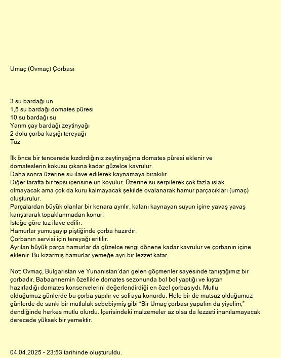 Not: Ovmaç, Bulgaristan ve Yunanistan’dan gelen göçmenler sayesinde tanıştığımız bir çorbadır. Babaannemin özellikle domates sezonunda bol bol yaptığı ve kıştan hazırladığı domates konservelerini değerlendirdiği en özel çorbasıydı. Mutlu olduğumuz günlerde bu çorba yapılır ve sofraya konurdu. Hele bir de mutsuz olduğumuz günlerde de sanki bir mutluluk sebebiymiş gibi “Bir Umaç çorbası yapalım da yiyelim,” dendiğinde herkes mutlu olurdu. İçerisindeki malzemeler az olsa da lezzeti inanılamayacak derecede yüksek bir yemektir.