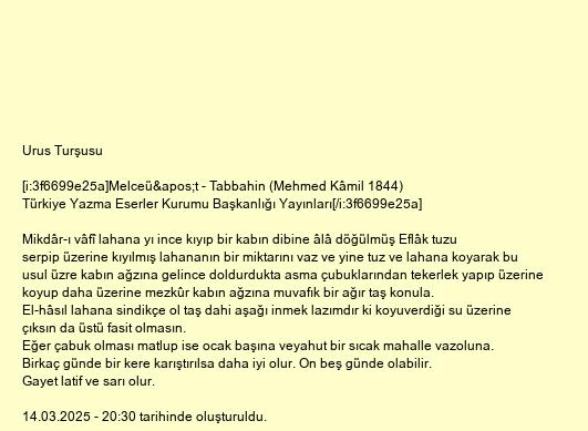 Mikdâr-ı vâfî lahana yı ince kıyıp bir kabın dibine âlâ döğülmüş Eflâk tuzu serpip üzerine kıyılmış lahananın bir miktarını vaz ve yine tuz ve lahana koyarak bu usul üzre kabın ağzına gelince doldurdukta asma çubuklarından tekerlek yapıp üzerine koyup daha üzerine mezkûr kabın ağzına muvafık bir ağır taş konula.