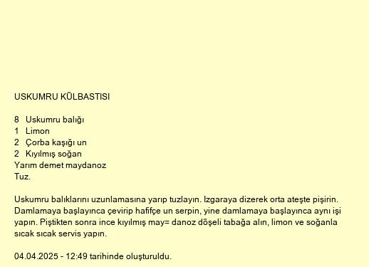 Uskumru balıklarını uzunlamasına yarıp tuzlayın. Izgaraya dizerek orta ateşte pişirin. Damlamaya başlayınca çevirip hafifçe un serpin, yine damlamaya başlayınca aynı işi yapın. Piştikten sonra ince kıyılmış may= danoz döşeli tabağa alın, limon ve soğanla sıcak sıcak servis yapın.