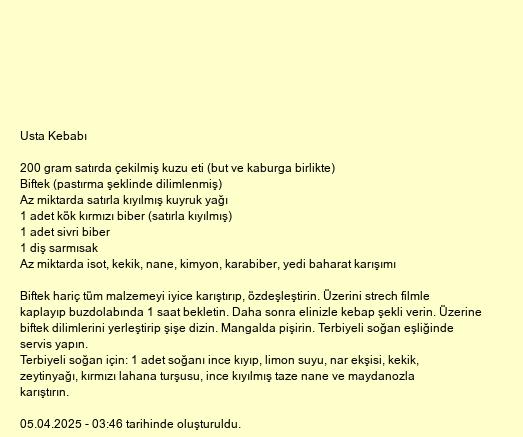 Biftek hariç tüm malzemeyi iyice karıştırıp, özdeşleştirin. Üzerini strech filmle kaplayıp buzdolabında 1 saat bekletin. Daha sonra elinizle kebap şekli verin. Üzerine biftek dilimlerini yerleştirip şişe dizin. Mangalda pişirin. Terbiyeli soğan eşliğinde servis yapın.