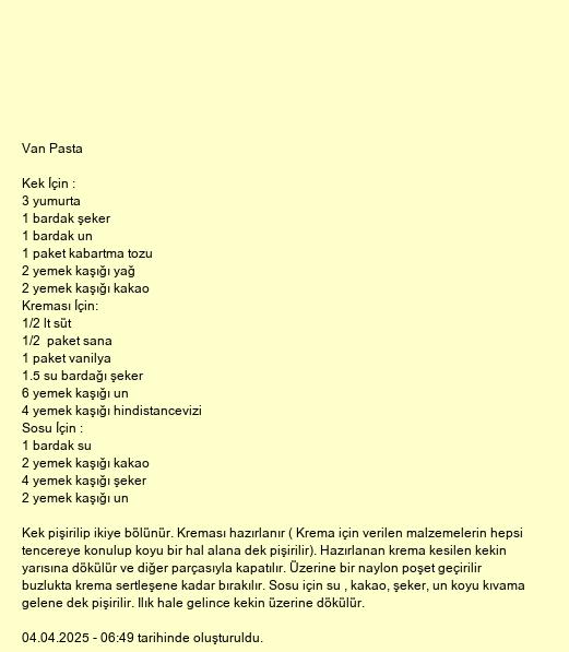 Kek pişirilip ikiye bölünür. Kreması hazırlanır ( Krema için verilen malzemelerin hepsi tencereye konulup koyu bir hal alana dek pişirilir). Hazırlanan krema kesilen kekin yarısına dökülür ve diğer parçasıyla kapatılır. Üzerine bir naylon poşet geçirilir buzlukta krema sertleşene kadar bırakılır. Sosu için su , kakao, şeker, un koyu kıvama gelene dek pişirilir. Ilık hale gelince kekin üzerine dökülür.