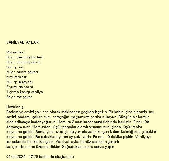 Badem ve cevizi çok ince olarak makineden geçirerek çekin. Bir kabın içine elenmiş unu, cevizi, bademi, şekeri, tuzu, tereyağını ve yumurta sarılarını koyun. Düzgün bir hamur elde edinceye kadar yoğurun. Hamuru 2 saat kadar buzdolabında bekletin. Fırını 190 dereceye ısıtın. Hamurdan küçük parçalar alarak avucunuzun içinde küçük toplar meydana getirin. Sonra yine avuç içinde yuvarlayarak kurşun kalem kalınlığında çubuklar meydana getirin. Bu çubuklara yarım ay şekli verin. Fırında 10 dakika pişirin. Vanilyayı toz şeker ile birlikte karıştırın. Vanilyalı aylar henüz sıcakken şekerli karışımı, bunların üzerine dökün. Soğuduktan sonra servis yapın.