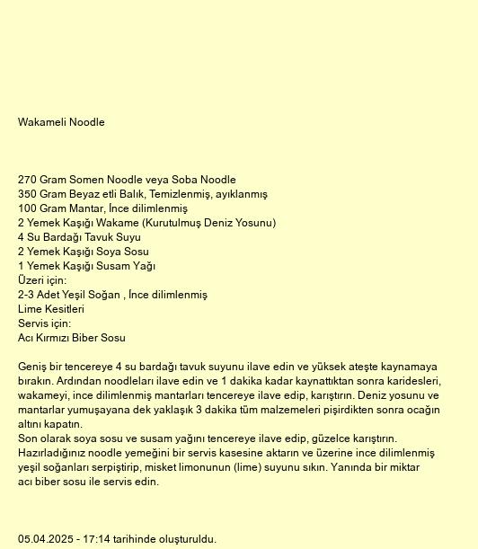 Son olarak soya sosu ve susam yağını tencereye ilave edip, güzelce karıştırın. Hazırladığınız noodle yemeğini bir servis kasesine aktarın ve üzerine ince dilimlenmiş yeşil soğanları serpiştirip, misket limonunun (lime) suyunu sıkın. Yanında bir miktar acı biber sosu ile servis edin.