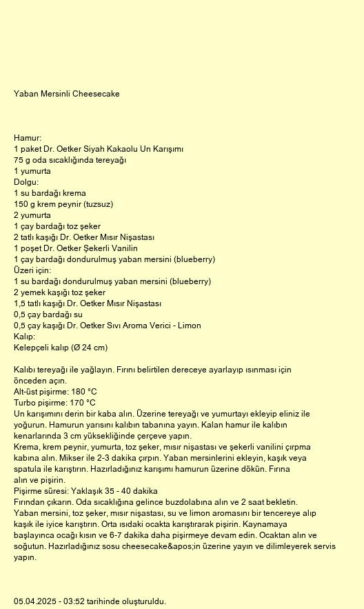 Krema, krem peynir, yumurta, toz şeker, mısır nişastası ve şekerli vanilini çırpma kabına alın. Mikser ile 2-3 dakika çırpın. Yaban mersinlerini ekleyin, kaşık veya spatula ile karıştırın. Hazırladığınız karışımı hamurun üzerine dökün. Fırına alın ve pişirin.