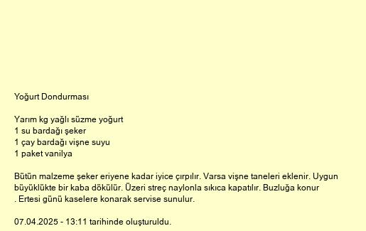Bütün malzeme şeker eriyene kadar iyice çırpılır. Varsa vişne taneleri eklenir. Uygun büyüklükte bir kaba dökülür. Üzeri streç naylonla sıkıca kapatılır. Buzluğa konur . Ertesi günü kaselere konarak servise sunulur.