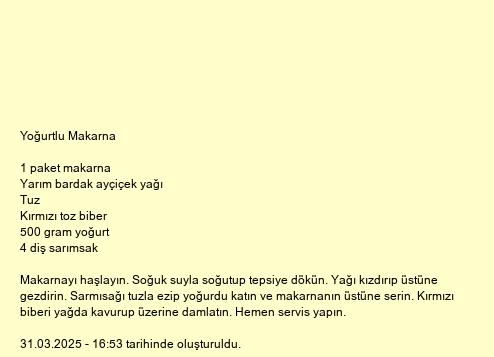 Makarnayı haşlayın. Soğuk suyla soğutup tepsiye dökün. Yağı kızdırıp üstüne gezdirin. Sarmısağı tuzla ezip yoğurdu katın ve makarnanın üstüne serin. Kırmızı biberi yağda kavurup üzerine damlatın. Hemen servis yapın.