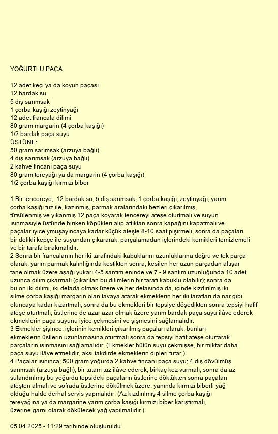 4 Paçalar ısınınca; 500 gram yoğurda 2 kahve fincanı paça suyu; 4 diş dövülmüş sarımsak (arzuya bağlı), bir tutam tuz ilâve ederek, birkaç kez vurmalı, sonra da az sulandırılmış bu yoğurdu tepsideki paçaların üstlerine döktükten sonra paçaları ateşten almalı ve sofrada üstlerine dökülmek üzere, yanında kırmızı biberli yağ olduğu halde derhal servis yapmalıdır. (Az kızdırılmış 4 silme çorba kaşığı tereyağına ya da margarine yarım çorba kaşığı kırmızı biber karıştırmalı, üzerine garni olarak dökülecek yağ yapılmalıdır.)