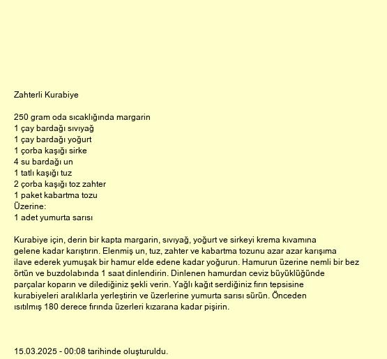 Kurabiye için, derin bir kapta margarin, sıvıyağ, yoğurt ve sirkeyi krema kıvamına gelene kadar karıştırın. Elenmiş un, tuz, zahter ve kabartma tozunu azar azar karışıma ilave ederek yumuşak bir hamur elde edene kadar yoğurun. Hamurun üzerine nemli bir bez örtün ve buzdolabında 1 saat dinlendirin. Dinlenen hamurdan ceviz büyüklüğünde parçalar koparın ve dilediğiniz şekli verin. Yağlı kağıt serdiğiniz fırın tepsisine kurabiyeleri aralıklarla yerleştirin ve üzerlerine yumurta sarısı sürün. Önceden ısıtılmış 180 derece fırında üzerleri kızarana kadar pişirin.