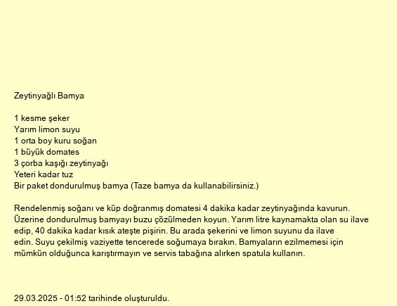 Rendelenmiş soğanı ve küp doğranmış domatesi 4 dakika kadar zeytinyağında kavurun. Üzerine dondurulmuş bamyayı buzu çözülmeden koyun. Yarım litre kaynamakta olan su ilave edip, 40 dakika kadar kısık ateşte pişirin. Bu arada şekerini ve limon suyunu da ilave edin. Suyu çekilmiş vaziyette tencerede soğumaya bırakın. Bamyaların ezilmemesi için mümkün olduğunca karıştırmayın ve servis tabağına alırken spatula kullanın.