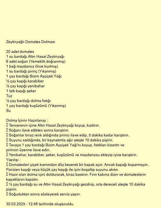 Hazır olan dolma içini doldurarak, biraz bastırın. Fırın kabına dizin ve domateslerin kapaklarını kapatın.