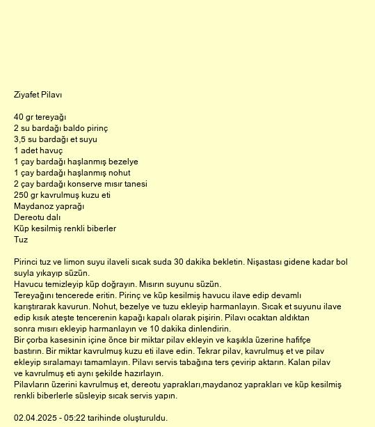 Bir çorba kasesinin içine önce bir miktar pilav ekleyin ve kaşıkla üzerine hafifçe bastırın. Bir miktar kavrulmuş kuzu eti ilave edin. Tekrar pilav, kavrulmuş et ve pilav ekleyip sıralamayı tamamlayın. Pilavı servis tabağına ters çevirip aktarın. Kalan pilav ve kavrulmuş eti aynı şekilde hazırlayın.